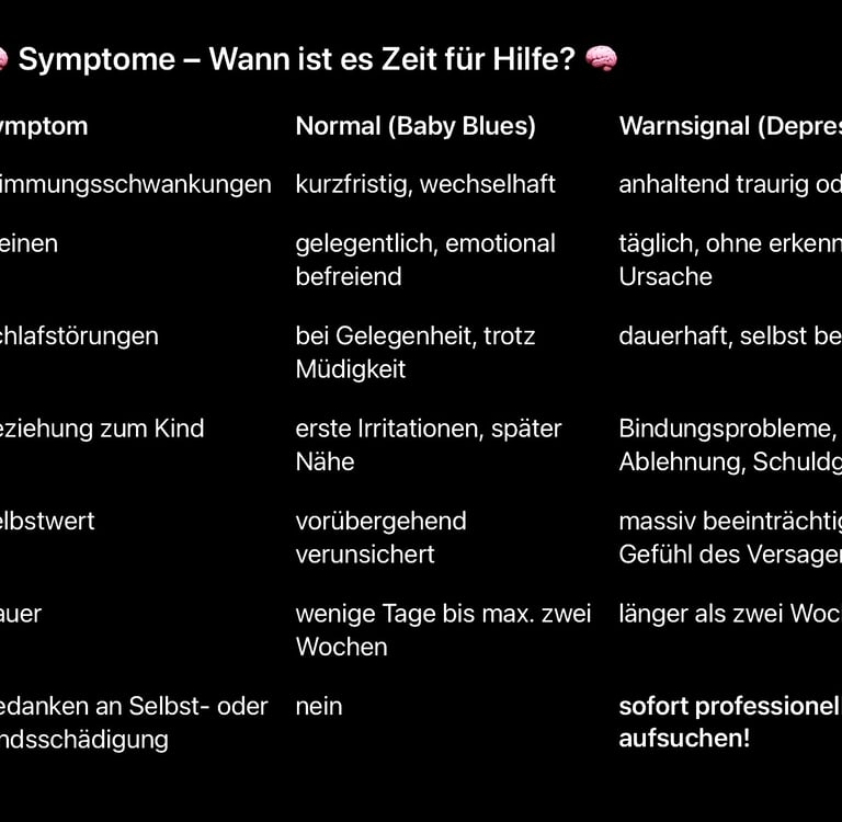 Die postpartale ( post = nach , partal = die Geburt betreffend ) Depression entwickelt sich meist schleichend innerhalb der ersten 6 - 12 Wochen nach der Geburt, kann aber auch später auftreten. Typische Anzeichen : ❗️Tiefe Traurigkeit und Antriebslosigkeit über Tage / Wochen ❗️Gefühl der Überforderung, Versagensängste ❗️ Bindungsprobleme zum Kind oder das Gefühl, keine Liebe empfinden zu können ❗️Schlaflosigkeit trotz Erschöpfung❗️ Schuldgefühle, Reizbarkeit, Rückzug ❗️Körperliche Beschwerden ohne organischen Befund ( Kopfschmerzen, Herzrasen, Appetitlosigkeit ) ‼️ Gedanken an Selbstverletzung oder, in seltenen Fällen, am Leben des Kindes zu zweifeln.